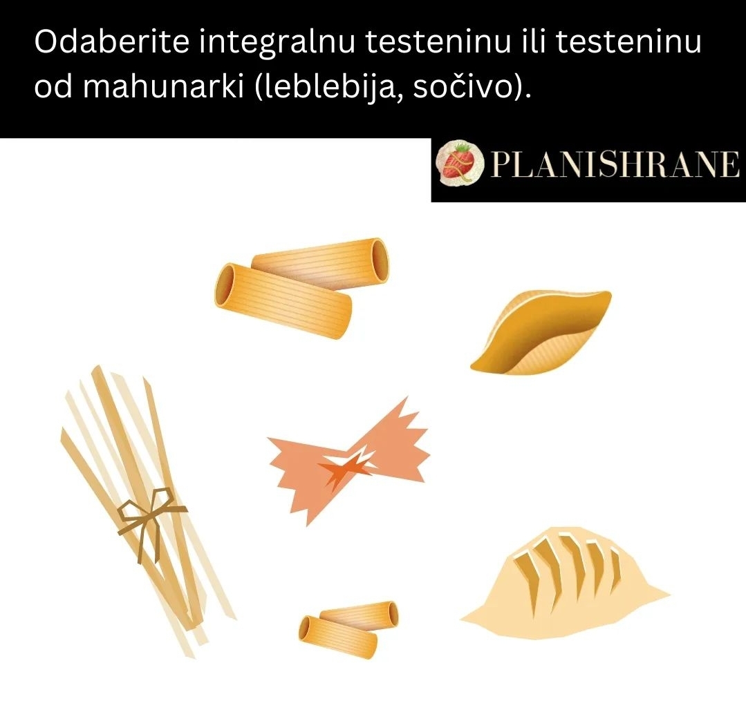 Birajte integralnu testeninu sa prostim sastavom, bez jaja. Može biti od integralne pšenice, spelte, heljde. Danas postoje i paste od sočiva i leblebija, koje imaju više proteina u sebi u odnosu na pastu od žitarica. Njen ukus je malo drugačiji od paste koja je obična ili integralna.